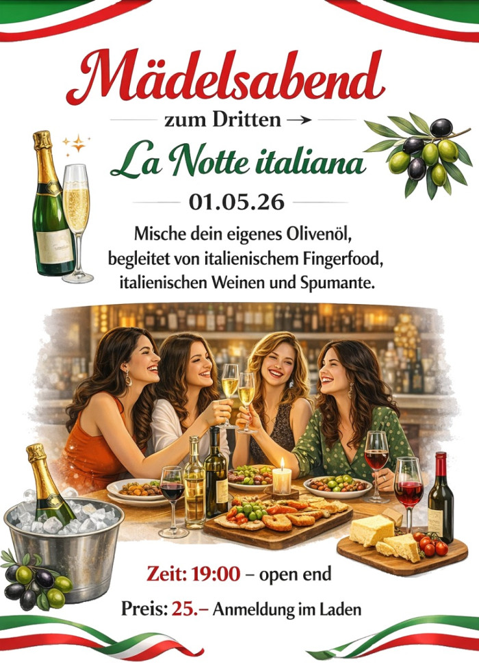 Mische dein eigenes Olivenöl, begleitet von italienischem Finnegrfood, italienischen Weinen und Spumate.